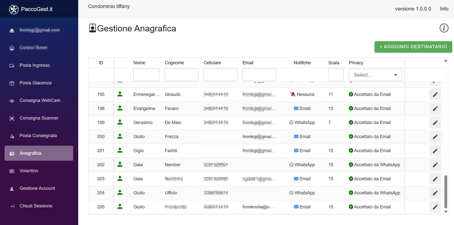 Gestisci i destinatari della corrispondenza, verifica l'accettazione della normativa privacy. Gli utenti possono accreditarsi tramite il responsabile del sistema oppure accreditarsi autonomamente. Gli utenti non devono creare un account o una password, tutto è stato studiato per essere il più immediato possibile.