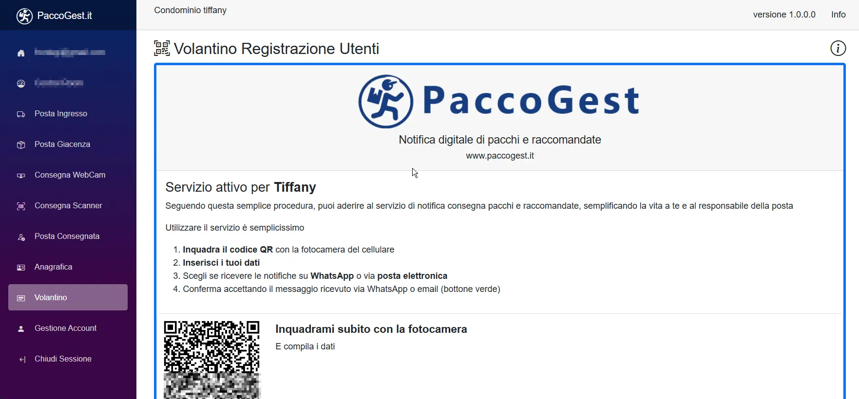 L'auto registrazione è disponibile tramite la funzione "Volantino". Inquadrando con la fotocamera del cellulare, in pochi istanti ci si può iscrivere a PaccoGest. PaccoGest supporta due modalità di gestione della normativa privacy.